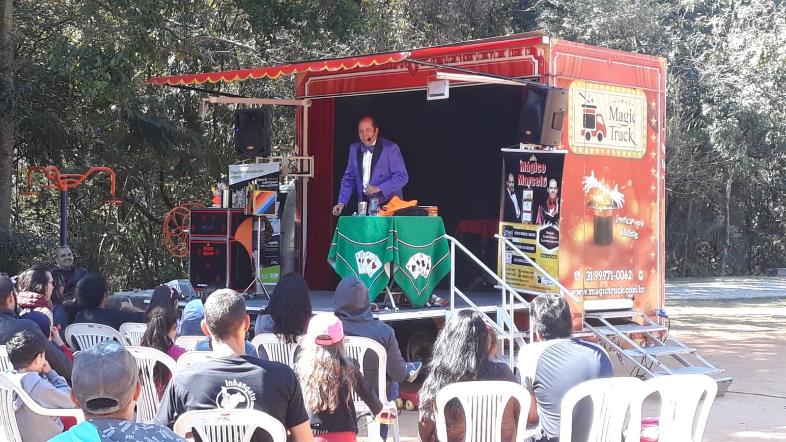 O artista conta que o caminhão é 100% sustentável, possui placas de energia solar. “É só abrir a porta lateral e lá está o palco, onde apresento o show de mágica”, diz Marcelo. Ele aproveita a diversão para passar recados importantes para as crianças, como cuidados com saúde bucal, meio ambiente e educação no trânsito… Há 100 cadeiras no Magic Truck e muito espaço aberto para quem for assistir aos shows.