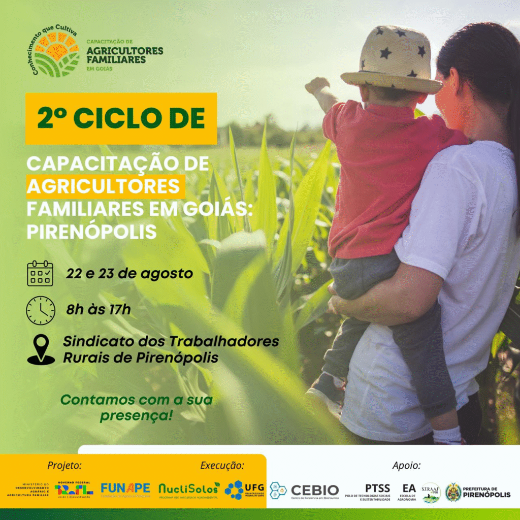 O Sindicato dos Trabalhadores Rurais de Pirenópolis irá promover o segundo ciclo de capacitação para agricultores familiares, nos dias 22 e 23 de agosto. A execução é da UFG e do MDA, em Pirenopolis, a execução é da UFG e do MDA em parceria com o Sindicato dos Trabalhadores Rurais e a Prefeitura Municipal. O objetivo é oferecer cursos e atividades que fortaleçam a agricultura familiar na região, visando o desenvolvimento sustentável, a geração de renda e a melhoria da qualidade de vida dos agricultores.
