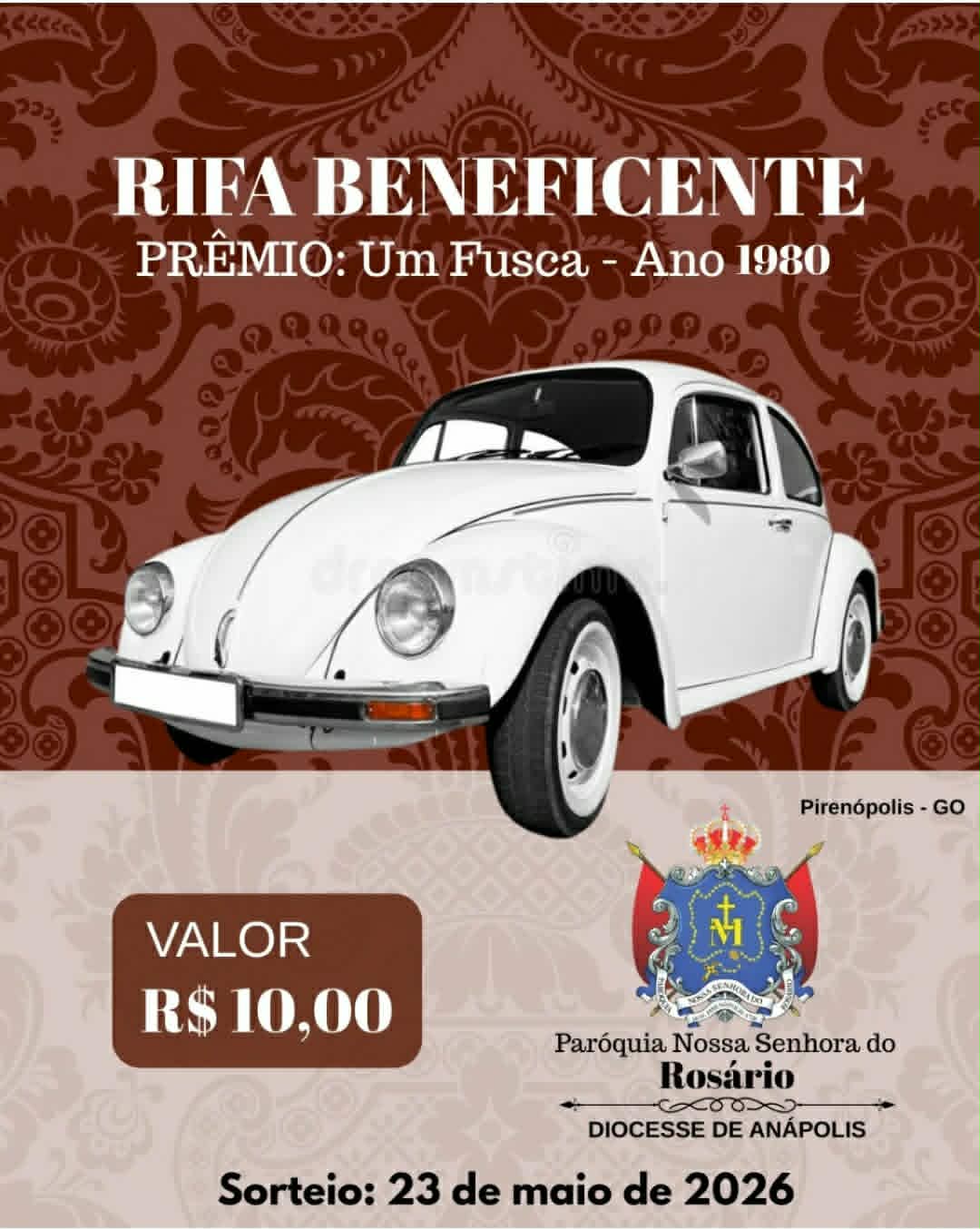 A Paróquia Nossa Senhora do Rosário em Pirenópolis está realizando uma rifa beneficente com um Fusca 1980 como prêmio principal. A iniciativa, chamada de “Ação Entre Amigos”, visa arrecadar fundos para a manutenção da paróquia e auxílio à comunidade local, o sorteio será dia 23 de maio.
