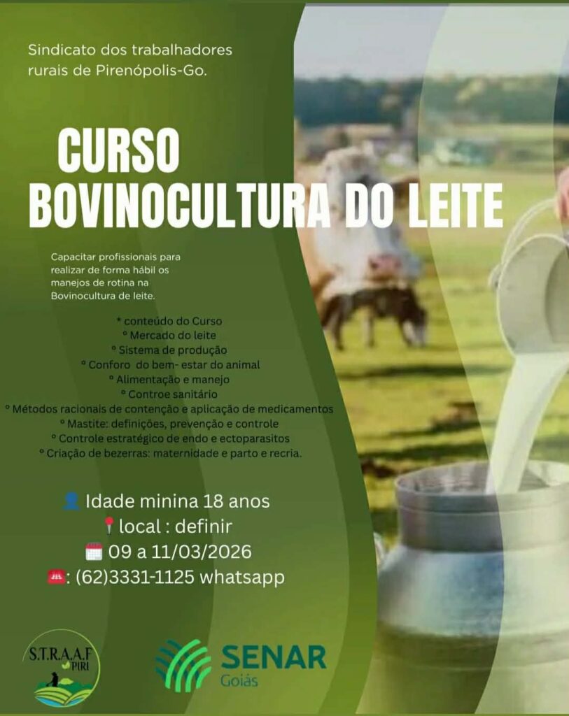 O Sindicato dos Trabalhadores Rurais de Pirenópolis em parceria com o Senar (Serviço Nacional de Aprendizagem Rural), irão oferecer Curso de Bovinocultura de Leite focados em capacitação prática para aumentar produtividade e qualidade. As inscrições já estão abertas e podem ser feitas pelos telefones 3331.1125 – 98535.5513 ou ir até a sede do STRAAF que está localizada na Avenida Sizenando Jayme, 19.