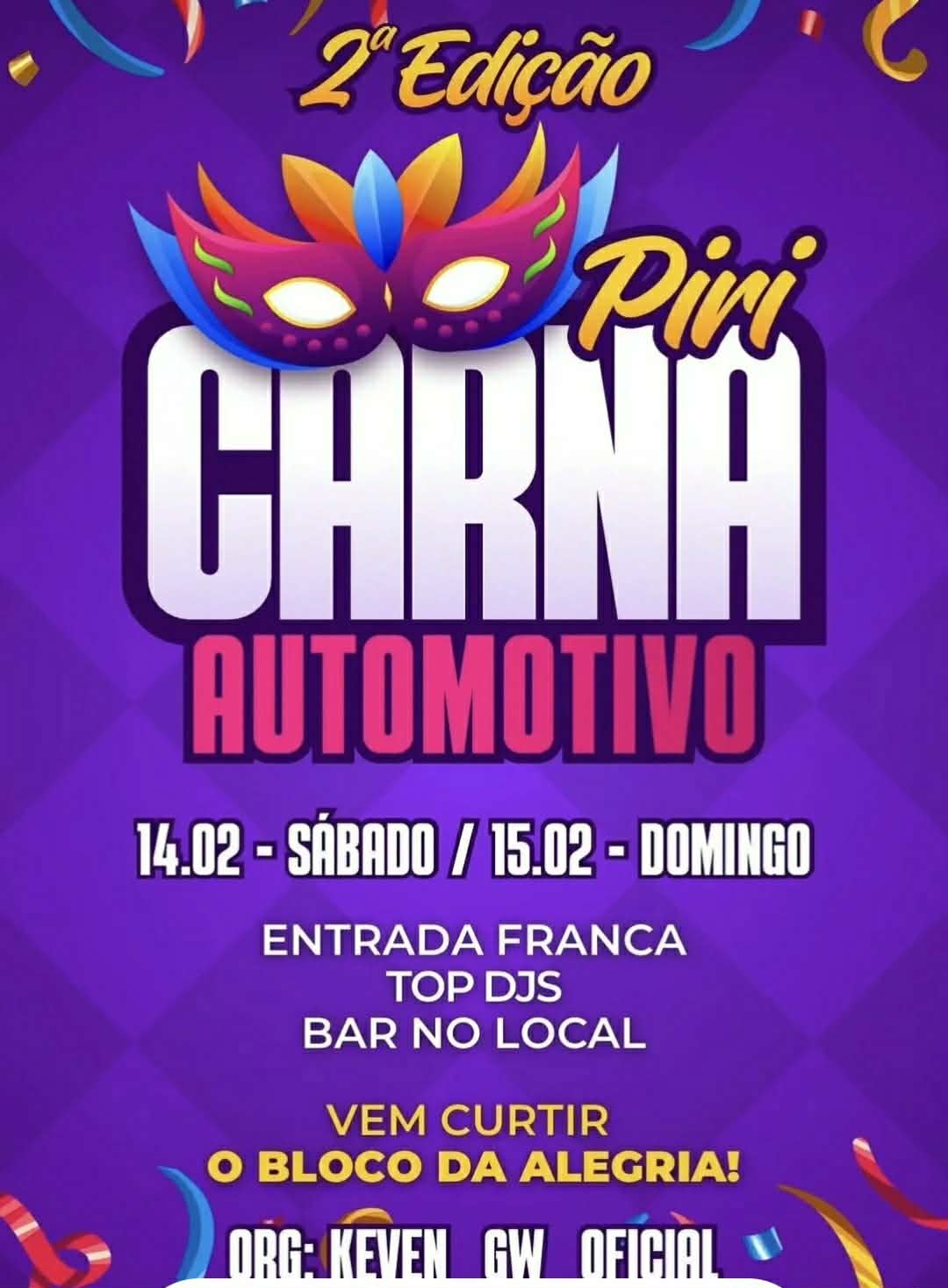 A 2ª edição do Piri Carna Automotivo está confirmada para este fim de semana, sábado e domingo, dias 14 e 15 de fevereiro de 2026, em Pirenópolis.