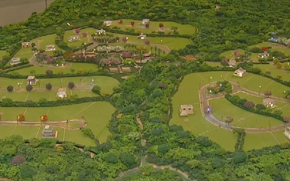 Maquete mostra a área do condomínio Aldeia do Vale Pirenópolis, que está sendo construída em meio a dois sítios arqueológicos do século XVIII e do período pré-colonial — Foto: Reprodução/TV Anhanguera
